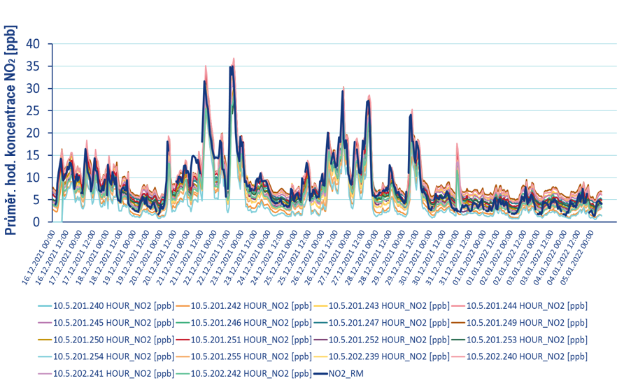 Obr. 4. Průběhy průměrných hodinových koncentrací NO2 (ppb) naměřených jednotlivými senzorickými stanicemi (v legendě označeny číslem) a referenčním analyzátorem (NO2_RM).