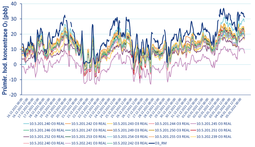 Obr. 5. Průběhy průměrných hodinových koncentrací O3 (ppb) naměřených jednotlivými senzorickými stanicemi (v legendě označeny číslem) a referenčním analyzátorem (O3_RM).
