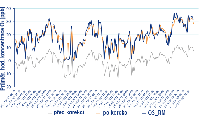 Obr. 6. Průběh průměrných hodinových koncentrací O3 (ppb) naměřených senzorem před korekcí (šedá linie), po korekci (oranžová linie) a referenčním monitorem (O3_RM; modrá linie).