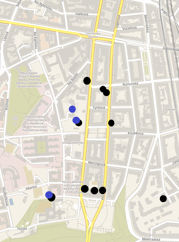 Další dva senzory byly nainstalovány do vnitrobloku základní školy na adrese Legerova 1878/5 a jeden byl umístěn na travnatý pozemek vodojemu Pražských vodovodů a kanalizací (50° 04' 20.7" N 14° 25' 43.9" E; Obr. 3). Pro možnost monitoringu pozaďových koncentrací této dopravně zatížené části Prahy byly dále instalovány senzory na střešní meteorologickou stanici Praha Karlov (50° 04' 09.5" N, 14° 25' 40.0" E; 1 senzor) a na střechu Le Palais Art Hotel Prague (50° 04' 11.493" N, 14° 26' 4.210 "E; 1 senzor). Dva senzory jsou dále umístěny pro kontrolní srovnání na hot-spotu automatického imisního monitoringu Praha 2 - Legerova (50° 04' 20.6" N, 14° 25' 50.4" E).